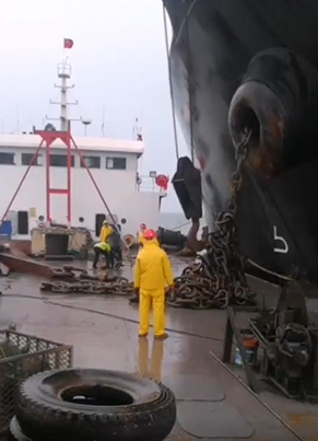3、從“惰鏈”一邊的船舷放出掛纜與保險(xiǎn)纜,讓卸扣和其連接。掛纜和保險(xiǎn)纜的一頭就系緊纏在船頭部的纜樁上。